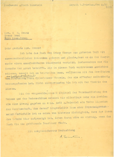 In 1931, Albert Einstein wrote the above letter offering his thoughts on Henry George’s book, Progress and Poverty.