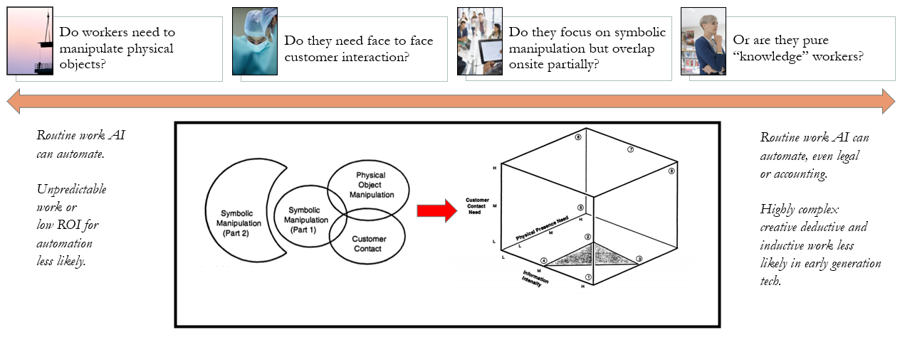 Some research has been done around which types of activities are best suited to remote work. As it turns out one of the earliest models was developed by Apte over 25 years ago. Figure 3 provides this model for understanding and plotting which job functions align well with remote work and which align with on-site work or a hybrid version. Essentially, Symbolic Manipulation jobs fit with remote work and Physical Object Manipulation align with on-site work along a continuum. In a recent talk, I proposed to overlay this model with the application of AI technology. Specifically, we might consider which of these domains could see AI accelerate the automation of the work and thereby facilitate further remote relocation of the job functions (or not).
